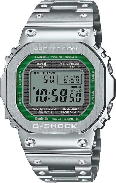 初代G-SHOCKのDNAを受け継ぎ、先進機能と都会的な美しさを融合したフルメタルモデル。グリーン液晶のレトロモダンな演出。高剛性フルメタルケースと耐衝撃構造の融合。Bluetoothとソーラーを搭載した現代的G-SHOCKの象徴。