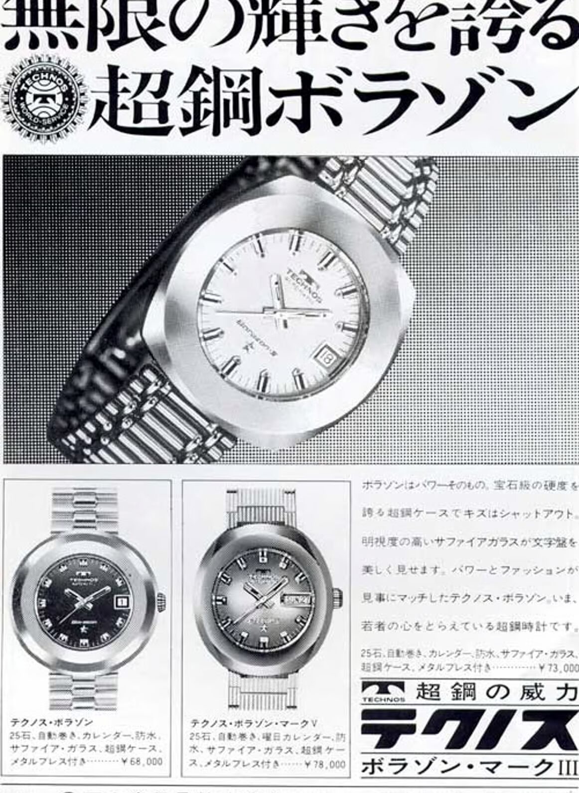 過去のテクノスの時計は、スイス製の機械式時計が中心で、高級時計ブランドとしての地位を築いていました。1960年代から70年代にかけては、オートマチック(自動巻き)ムーブメントを搭載したモデルが多く、耐久性の高いステンレススチールケースが主流でした。また、ヴィンテージモデルには、現在では希少な「スイスメイド」の刻印があり、これが価値を高める要素となっています。
