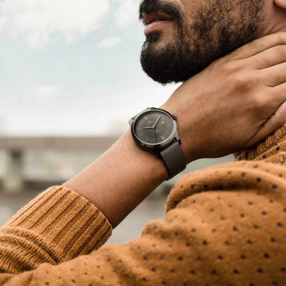 時計の文字盤の色と、洋服や靴の色味を合わせることで、統一感のあるおしゃれなコーディネートになります。例えば、ネイビーのジャケットにネイビーの文字盤のテクノスを合わせると、スタイリッシュな印象になります。