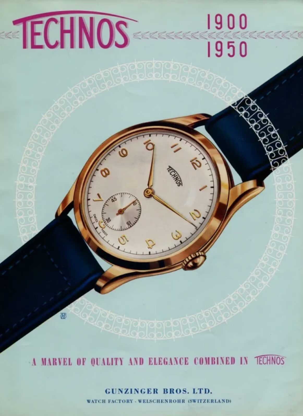 テクノスの歴史は1900年、スイスのジュラ地方にあるヴェルシェンローアで時計職人メルヒオール・グンツィンガーが時計工房を設立したことから始まりました。時計製造の伝統が根付くスイスで生まれたブランドであり、1924年には正式に「テクノス」の商標が登録され、本格的に市場展開を開始します。当時のテクノスは、スイス製の高品質な機械式時計を提供するブランドとして、世界各国に輸出され、多くの時計愛好家に愛されました。