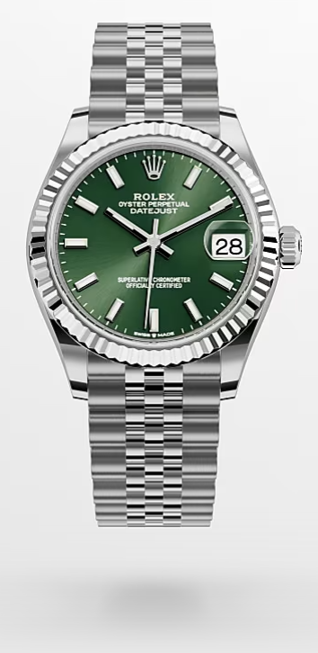 1945年に誕生した世界初の瞬時日付表示機能を搭載したモデル。洗練されたデザインと高い実用性を兼ね備え、ロレックスの象徴的な存在として幅広い層に支持される。フルーテッドベゼルとサイクロップレンズが独特の美しさを引き立て、クラシックとモダンが融合したタイムピース。■ ケースサイズ36mm、ケース素材ステンレススチール(オイスタースチール)とホワイトゴールド、ブレスレットジュビリーブレスレット、ガラス素材サファイアクリスタル、防水性能100m、デザインはシルバー文字盤にローマンインデックス、機能は時・分・秒表示および日付表示、価格約120万円前後、重量約125g、搭載キャリバー3235、自動巻き機械式ムーブメント、精度-2/+2秒/日、振動数28,800振動/時、パワーリザーブ約70時間。