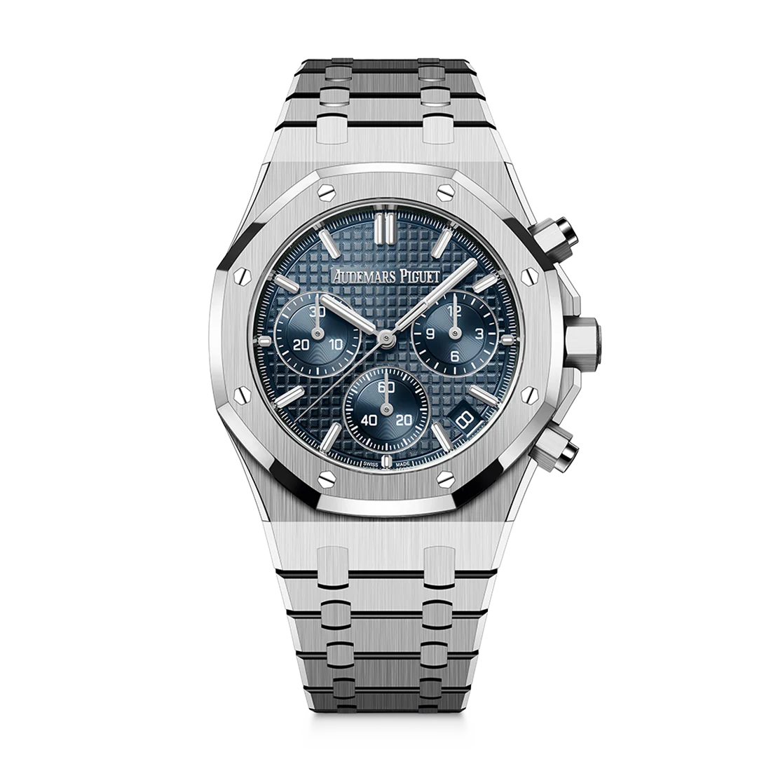 1972年に誕生したラグジュアリースポーツウォッチ「ロイヤル オーク」の伝統を受け継ぐクロノグラフモデル。八角形ベゼルとグランドタペストリーダイヤルが生み出す独特の立体感。ブルー文字盤にシルバーカウンターを配し、洗練されたスポーティな印象を強調。41mmケースでバランスの取れたサイズ感を実現。スタイリッシュなデザインと優れた計測機能を兼ね備えたアイコンピース。