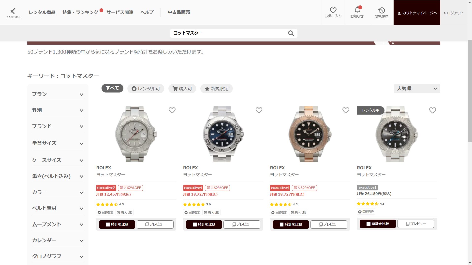 カリトケは、高級時計を月額料金でレンタルできるサブスクリプションサービスです。ヨットマスターを購入する前に試すことで、実際の使用感やライフスタイルとの相性を確認できる点が大きなメリットです。
