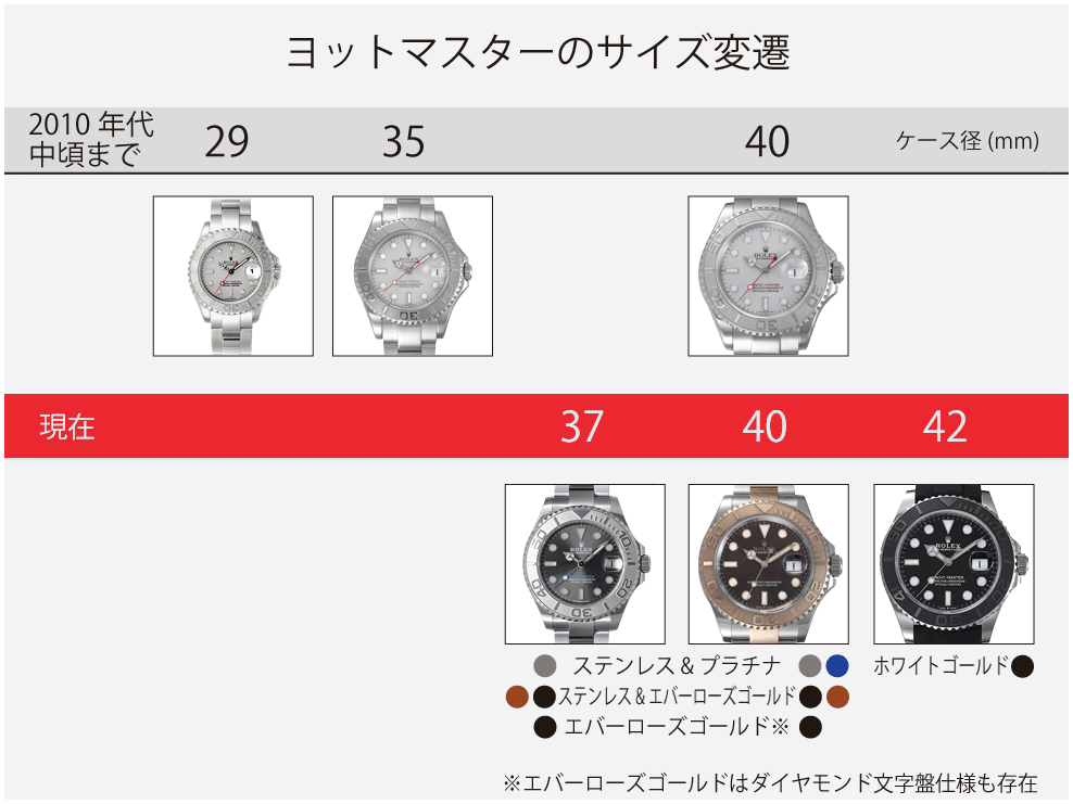ロレックスのヨットマスターシリーズは、豊富なサイズ展開が特徴です。主に37mm、40mm、42mmの3種類があり、それぞれのサイズが異なるユーザーのニーズに応えています。